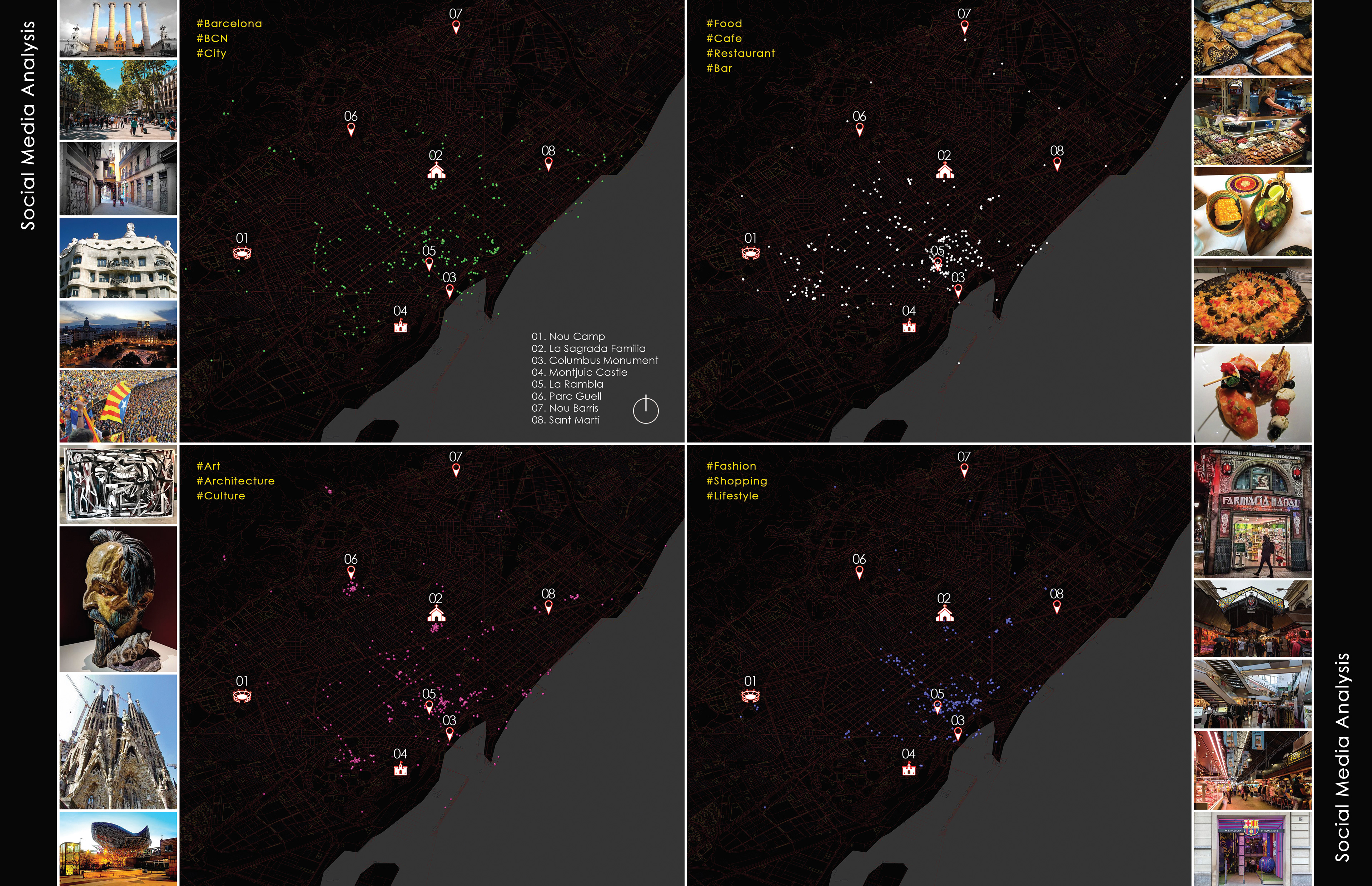 Social media has the potential to help us plan our cities by providing us with specific required data. It has the power to become a monitoring tool to scrutinize and provide valuable input about public events, activities in and around the city. In order to test its potential, the project intends to analyse the lively spaces, high and low activity zones in the city of Barcelona. The social media hashtags can be the source route for the data required. They provide us with the images and geographical locations the images were clicked from and give us a gist of what people like to capture and post on social media. The geographical locations help us analyse parts of cities that are visited relating to the hashtags. The project concludes with generative design variants for the ‘Gaudi Pavilion’ using Wallacei evolutionary solver.